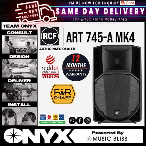 RCF ART 745-A MK4 - tai aukštos klasės garsiakalbis, išsiskiriantis stipriais techniniais duomenimis ir pažangiais sprendimais. Šio garsiakalbio stiprintuvas pasiekia net 1 400 W maksimalią galią (700 W RMS). RCF ART 745-A MK4 gali pasiekti 133 dB maksimalų garso slėgį (matuojant 1 m atstumu). Garsiakalbyje įmontuotas 15 colių neodimio žemųjų dažnių garsiakalbis ir 1,4 colio titano kompresijos draiveris su 4,0 colio balso rite. Ši kombinacija leidžia tiksliai perteikti vokalus ir efektyviai skleisti garsą.