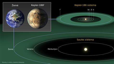 Saulės ir Kepler186 planetų sistemų palyginimas. Žaliai pažymėtos gyvybės zonos, kur gali egzistuoti skystas vanduo.