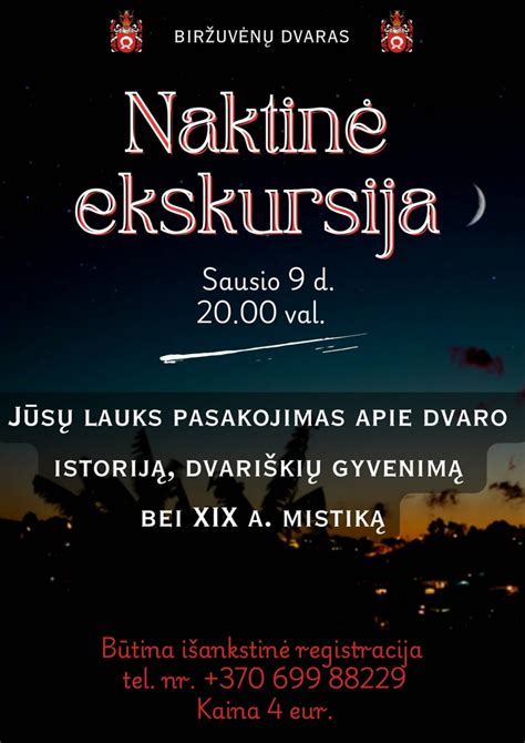 - Nakvynė: Kadangi renginio programa užsitęs iki vėlaus vakaro, rekomenduojame rinktis nakvynę šalia esančiose apgyvendinimo įstaigose. Biržuvėnų dvaras šiuo metu negali pasiūlyti apgyvendinimo paslaugos.