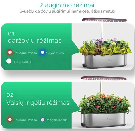 | LED apšvietimas augalams | 5:00-8:30 ir 18:30-22:00 (7 val.) |