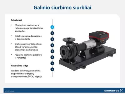 | Išcentriniai siurbliai | Vandens tiekimas, drėkinimas, slėgio palaikymas, priešgaisrinės sistemos |