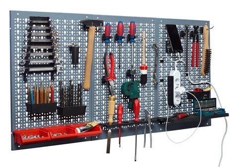 - Pakabinamos įrankių sienelės: Tai vietos taupymo priemonės. Šios sienelės efektyviai išnaudoja vertikalią erdvę, todėl idealiai tinka kompaktiškose patalpose. Jose įrankiai išlieka matomi ir pasiekiami ranka, todėl taip supaprastėja darbo procesas.