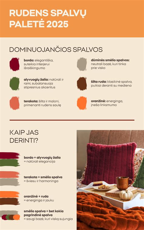 Pasirinkus tinkamą spalvų paletę, galite transformuoti savo namus ir sukurti rudenį primenančią atmosferą, kuri džiugins jus ir jūsų svečius.