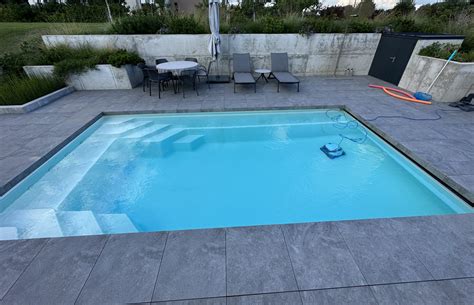 Privatus lauko baseinas su Covrex® žaliuzi sistema, kurios susukimo mechanizmas paslėptas po viršutiniais baseino laiptais. Papildomai sumontuota „Multi jet” masažinė sistema.