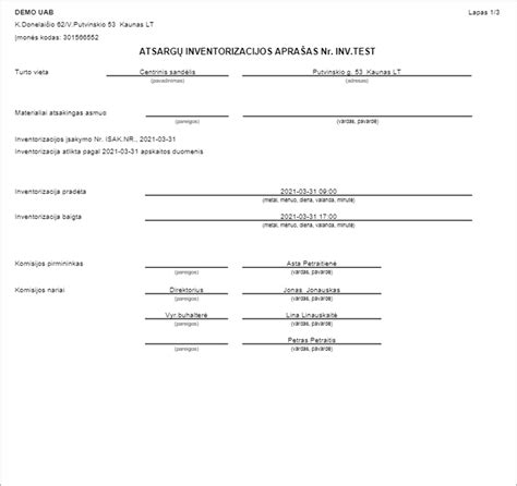 Taip pat svarbu, kad pajamų ir išlaidų dokumentai, nurodant paskutinių datas ir numerius, atiduoti į buhalteriją, neužpajamuoto i.r nenurašyto turto nėra, įrašas „Visą šiame inventorizacijos apraše išvardytą turtą komisija, man dalyvaujant, patikrino natūra ir įrašė į aprašą, todėl inventorizacijos komisijai pretenzijų neturiu. Už išvardyto turto išsaugojimą atsakau“ ir materialiai atsakingo asmens parašas.
