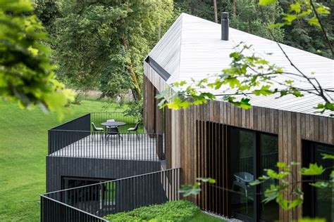 Šis „Arches“ studijos architektų projektas - tai šiuolaikiška tradicinės lietuviškos medinės sodybos, pastatytos ant kalvos šlaito, versija. Namas buvo suprojektuotas taip, kad pakibtų virš slėnio, o langai atvertų vaizdus į apylinkes.