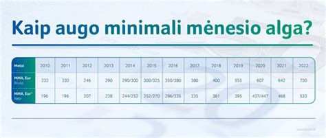 Per penkerius metus MMA išaugo beveik 400 eurų arba daugiau nei 60 %. Europos Sąjungos mastu Lietuva vis dar išlieka tarp tų šalių, kur minimali alga yra mažesnė už ES vidurkį, tačiau sparčiai artėja prie Vakarų Europos šalių standartų.