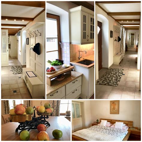 Medinės spintelės, lentynos bei kiti pagrindiniai baldai - protingas pasirinkimas, kadangi labiausiai atkreipdami į save dėmesį (nes užima daugiausiai erdvės), šie baldai sukurs kaimiško jaukumo efektą. Jei norite labiau kaimiškos išvaizdos, galite sienas arba grindis iškloti plytelėmis.