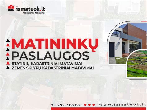| Žemės sklypo kadastriniai matavimai | Nuo [kaina] Eur | Kaina priklauso nuo sklypo ploto ir sudėtingumo |