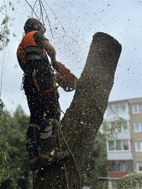 Sudėtingas medžio pjovimas netoli pastatų.