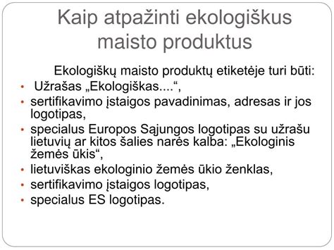 Leidžiama vartoti tik tuos teiginius apie maistingumą ir sveikumą, kurie atitinka 2006 m. ES pagaminti ir supakuoti ekologiški maisto produktai turi būti paženklinti ES ekologinės gamybos logotipu. Maisto produktus, kuriuos gaminant naudotos įpakavimo dujos ir taip pailgintas jų tinkamumo vartoti terminas, papildomu užrašu „Supakuota naudojant apsaugines dujas“. Maisto produktus su saldikliu (saldikliais) papildomu užrašu „Su saldikliu (saldikliais)“. Šis užrašas turi būti šalia parduodamo maisto produkto pavadinimo.