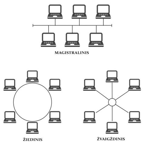 Pagrindinės tinklo topologijos: magistralės, žvaigždės ir žiedo