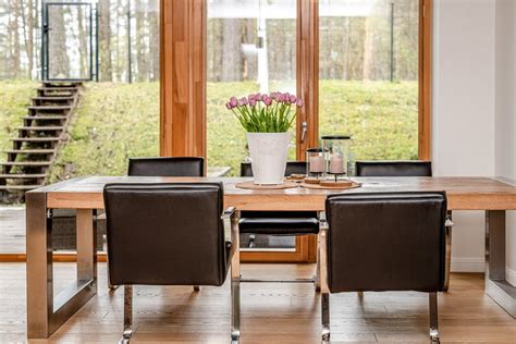 Itin svarbi namų zona - valgomasis, čia šeimininkai ne tik prisėda pietų ar vakarienės, bet ir rengia priėmimus, sprendžia verslo reikalus. Valgomojo akcentais tapo prancūzų modernaus meno atstovo Juliano Mayor kurtas stalas stikliniu stalviršiu ir virš jo kabantis puošnus itališkas šviestuvas. Stalas pagamintas iš suvirinto nerūdijančio plieno, o jo veidrodinis paviršius nuostabiai žaidžia su natūralia dienos šviesa, gausiai sklindančia pro didelius valgomojo langus.