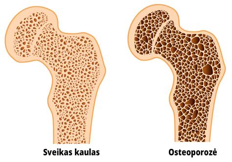 Kaulų struktūra: sveikas kaulas (kairėje) ir osteoporozės paveiktas kaulas (dešinėje)