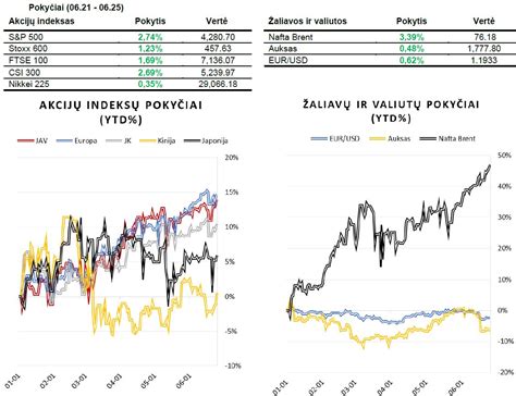 Pagrindiniai JAV indeksai vėl atnaujino savo visų laikų aukštumas po praėjusios savaitės nuosmukio ir sugebėjo pademonstruoti didžiausius savaitinius prieaugius nuo balandžio mėnesio. Tuo tarpu J. Bidenas paskelbė, kad dvipartinė 10 senatorių grupė susitarė dėl maždaug 1 trilijono JAV dolerių vertės infrastruktūros išlaidų planavimo per ateinančius penkerius metus.
