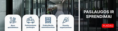 Esame novatoriai ir be būtiniausių biuro prekių, siūlome plačias paslaugų galimybes iš vienų rankų: perkraustymo, meistrų bei valymo paslaugos, biuro augalai, užkandžiai ir vaisiai į biurą, vandens stotelių ir kavos aparatų nuoma, konferencijos įrangos nuoma, IT sprendimai ir kt.