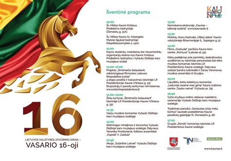 | Jonavos rajono savivaldybė | Vasario 16 d. | Lietuvos valstybės atkūrimo dienos koncertas „Lai girios Lietuvai siaudžia“ Didžiojoje salėje. Dalyvauja Jonavos kultūros centro, Jeronimo Ralio gimnazijos, Janinos Miščiukaitės meno mokyklos kolektyvai. Nepriklausomybės Stelos įteikimo ceremonija |