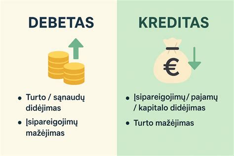 - Turtas: Debetas didina turto sąskaitas, o kreditas jas mažina.
