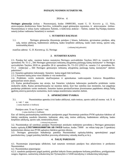 - Nuomininkas: Šalis, kuri naudojasi patalpomis ir moka nuomos mokestį.