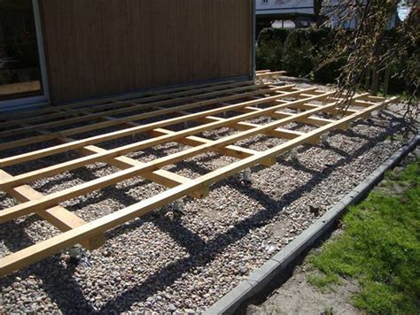 Ant įbetonuotų arba įsuktų į M tipo sraigtinių polių(Naudokite U tipo polius jei taip Jums patogiau) ilgasriegių montuojame atramines sijas 45×95 mm. Išgręžę skyles tašuose, užmauname tašą per sraigtus ir padedame ant poveržlės, kurią užsukame prieš tai. Sraigtus užveržiame veržlėmis iš viršaus, taip suspausdami siją. Nepamirškite, kad metalinės detalės turėtų būti cinkuotos arba nerūdijančio plieno.Lagėms/gulekšniams dažnai naudojamos 45×70 mm matmuo(arba 45×95 mm), priklausomai nuo to, koks tarpatramis ir leidžiamas aukštis. Jas pradėkite montuoti priešinga apatinių tašų kryptimi, geriausia pirmąją nuo antrosios lagės atitraukti apie 100 - 200 mm, kad suvaldyti galimą lentų rietimąsi, o vėliau kas 400 - 450 mm (centrai). Montuodami tokiais atstumais būsite tikri, kad terasa bus tvirta ir stabili, bei lentos nelinguos, nesisukinės nuo temperatūrinių ir drėgmės pokyčių. Lagės gali būti iki 30 cm ilgesnės nei paskutinė apatinė sija (prasikišti). Sumontavus lentas ir pridėjus paskutinę, bus aišku kokiu ilgiu nupjauti lages, kad terasa baigtųsi “sveika lenta“. Vėliau bus galima pritvirtinti dengiamąją plačią lentą iš šono, kad nesimatytų konstrukcija.